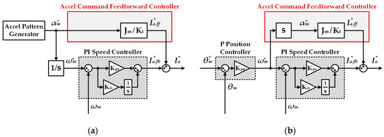 The acceleration command feedforward control loop of the PI-speed controller: (a) in the speed control system; and (b) in the position control system using the cascaded P-PI controller.