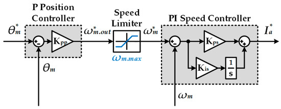 However, the speed limiter is used in the position control system because the motor angular speed is limited electrically and mechanically. In the cascaded P-PI controller, the speed limiter is located between the position controller and the speed controller, as shown in Figure 5.