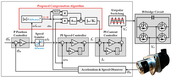 Figure 8 is a block diagram of the proposed EGR valve position control system, including the proposed compensation algorithm. The proposed compensator distinguishes the region by comparing the position controller output with the maximum speed of the speed limiter, and the output of the compensator, according to the region, is compensated to the speed controller. And the motor angular acceleration is required in the proposed compensator. The estimation using the derivative and filter generates noise or delay. Thus, the acceleration observer associated with the existing speed observer [17] is used in the proposed system [18]. The proposed position control system can improve the position response at the low control frequency without the influence of the derivative and the speed limiter.