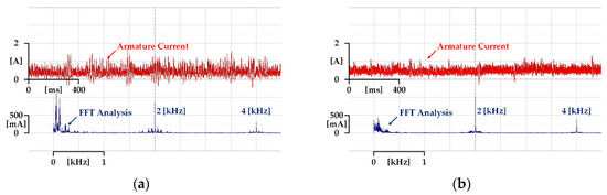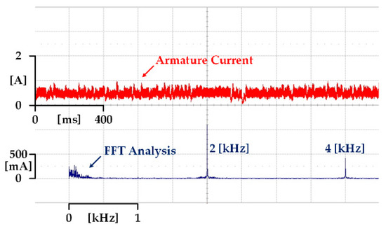 Figure 11 shows the armature current and fast fourier transform (FFT) analysis at steady state in the position response for the cascaded P-PI controller. Because the system was controlled by unipolar switching, the frequency of the current ripple was twice the switching frequency. Thus, current ripples of 2 kHz and 4 kHz were caused by the switching frequency and unipolar switching. Figure 12a shows the armature current and FFT analysis when the acceleration command through the derivative was compensated to the speed controller. Since the noise caused by the derivative was compensated for the current command controlled at the speed control frequency, a large current and torque ripple occurred at low frequencies of 100 Hz and 200 Hz. Low-frequency torque ripple causes problems, such as noise and vibration, in the EGR valve. However, when compensated by the proposed method instead of the derivative, the low-frequency current ripple was significantly reduced, as shown in Figure 12b. In addition, the noise and vibration of the EGR valve were also improved.
