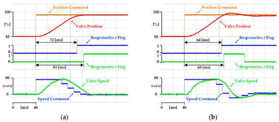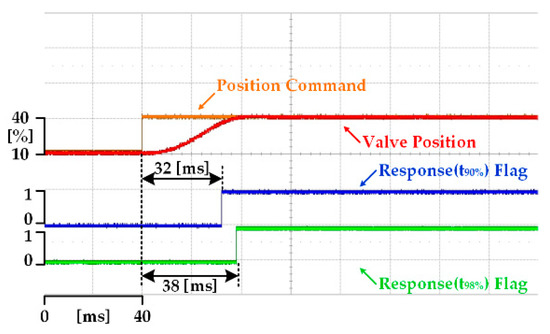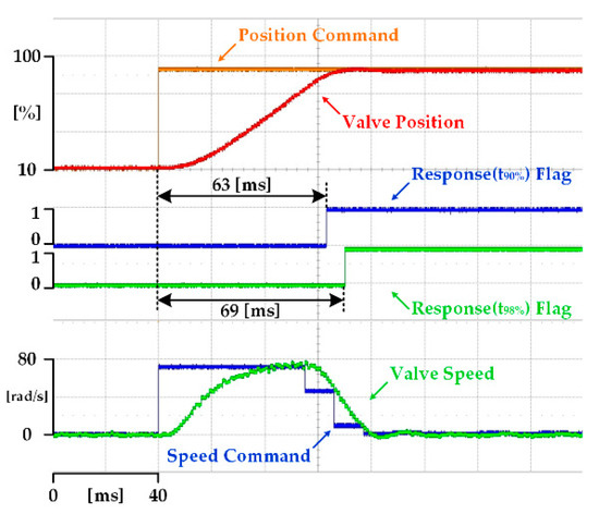 Figure 13 shows the position and speed response and the response flag in the position control system with the cascaded P-PI controller. The position command is the step input that changes from 10% to 90% when the maximum position of the EGR valve is 100%. The position response consisted of the position command and the EGR valve position, and the speed response included the speed command and the EGR valve speed. The response (t90%) flag became 1 when the EGR valve position was within +/−10% of the position command, and the response (t98%) flag was set to 1 when the position command was within +/−2%. Figure 13a shows the result when Kpp of the P-position controller was ωsc/4. Since the position response of the cascaded P-PI controller was the second order LPF as shown in (1), the maximum value of Kpp was ωsc/4 to avoid the underdamping, which causes the position overshoot. Thus, the system was controlled without the position overshoot, but the valve speed in the deceleration area did not fully follow the speed command due to the low control bandwidth, and the position response was also slow. In the case of Figure 13b, where the position controller gain was ωsc/2, the position response was faster as the position control bandwidth was increased. However, the valve speed could not follow the fast changing speed command in the deceleration area, and the position overshoot occurs because the speed control bandwidth was still low. Under the same experimental conditions as Figure 13b, the experimental results of the proposed position control system are shown in Figure 14. In the region I limited by the speed limiter, the valve acceleration was compensated to the speed controller. And the product of Kpp and the valve speed were compensated to the speed controller in the region II without the influence of the speed limiter. In particular, the fast response was obtained without the position overshoot because the valve speed completely followed the fast change of the speed command in the deceleration area.