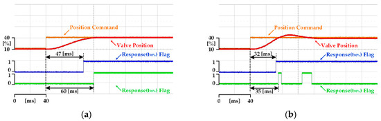 Since the position command of the EGR valve position control system has various positions, it is necessary to confirm the position response for the short distance as well as the long distance. Figure 15 shows the position and speed response and the response flag in the position control system with the cascaded P-PI controller. The position command was the step input that changed from 10% to 40%. Figure 15a,b shows the experimental results when the position controller gains were ωsc/4 and ωsc/2, respectively. Both experimental results showed the same trend as Figure 13. In Figure 15b, the position response was faster than the previous result, but the position overshoot occurred excessively, even though the position command was a short distance. Figure 16 shows the experimental results of the proposed position control system under the same experimental conditions as Figure 15b. The result of the proposed algorithm showed fast response without the position overshoot regardless of the distance of the position command.