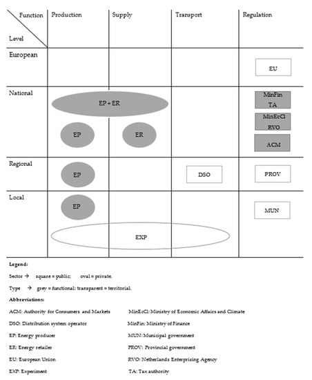 The experimenters are locally operating, territorial decision-making units. The HOA’s and cooperatives themselves are voluntary bodies, but a hybrid sometimes develops where a private party is the main developer and is either founding the HOA or cooperative, or paid by it to take on an important role in the design of the experiment. The functions that an experiment can fulfil under the EDSEP in the energy system can be any type of activity in the domain of energy production, supply, or grid management for projects grids, whereas large experiments are more constrained (see Section 2.2).