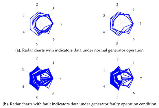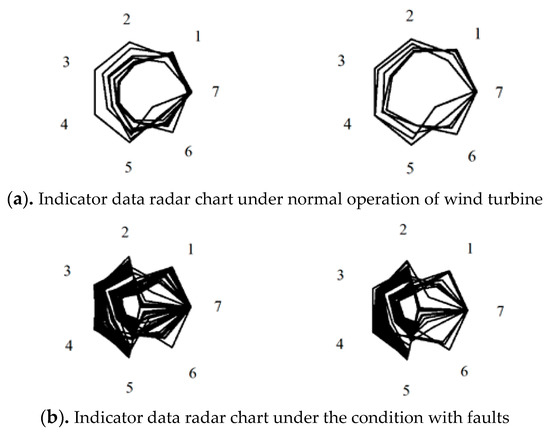 Based on the data extraction and processing as described above, two groups of radar charts are generated representing normal and faulty operation condition as shown in Figure 1. The wind speed is selected from 3 m/s to 20 m/s (cut-in and cut-off speed). Some of the data when wind speed is out of the range is removed. The collected data are plotted into the radar charts through the seven indicators selected and shown in Table 3, Table 5 and Table 7. In Figure 1, the numbers 1–7 represent the indicators, respectively, in Table 3, Table 5 and Table 7. The radar charts are distinguished by wind speed. For example, when the wind speed is 3 m/s, all indicators data under the condition is collected to plot the radar chart. In the graph, if the data is relatively stable, there are fewer curve lines to be observed as most of the frames are overlapping so that the pattern is regular and, otherwise, it is vice versa.