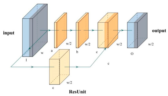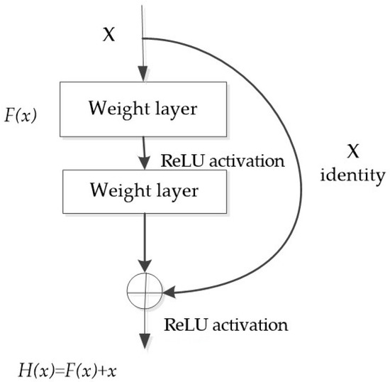 With increasing number of deep learning network layers, the features of different layers can be extracted. The more abstract the feature expression, the richer the semantic information. However, a simple increase in the number of original network layers in deep learning may result in gradient disappearance or gradient explosion. The traditional solutions generally use reasonable weight initialization and regularization methods to solve the gradient problem [23], but bring new problems of network performance degradation [24]. ResNet is a residual learning framework that can improve the network performance under the premise of increasing depth. ResNet’s residual unit structure diagram is shown in Figure 3 [25,26].