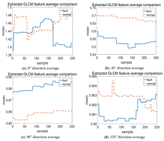Here, the average value and the variance are used as the GLCM features of the extracted image. Due to too many image samples, it is difficult to observe the effect of GLCM mean and variance graphics. Therefore, 250 indicator data radar charts representing fault operation and 250 indicator data radar charts representing normal operation are taken as samples to compare the mean and variance of radar chart GLCM features. Figure 7 shows the GLCM feature average comparison. The feature extraction of the radar charts from four directions of θ = 0°, 45°, 90°, 135°; and the average value of each of the 250 samples of the indicator data radar charts under faulty and normal operation states, respectively, are calculated.