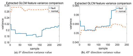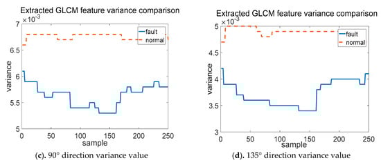 Figure 8 gives a comparison of GLCM feature variance values under two different wind turbine conditions. The feature extraction of the radar charts is from four directions of θ = 0°, 45°, 90°, 135°; and the variance values of 250 samples of the fault indicator data radar charts under fault and normal operation states, respectively, are calculated.