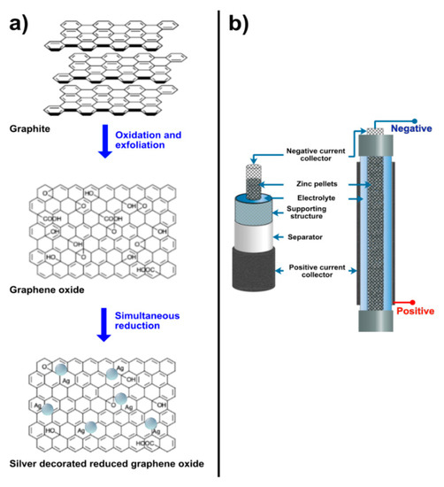 (a) Formation of silver nanoparticles decorated on reduced graphene oxide sheets by oxidation and exfoliation of graphite powder and simultaneous reduction of graphene oxide and silver ions, (b) a schematic diagram of the zinc–air battery.