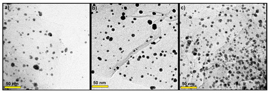The morphology of AgNP decorated onto rGO sheets was investigated via TEM (Figure 3). Thus, it can be seen in Figure 3a–c that silver nanoparticles were homogeneously distributed over the surface of rGO sheets without obvious aggregation. The samples showed several small AgNP uniformly distributed on the substrates. The AgNP were mostly distributed between 3 and 8 nm, and the mean particle size diameter was 5 nm. The size of AgNP observed was in line with the size estimated from XRD analysis. In Figure 3c, the sample 0.3 M AgNP/rGO displayed the highest number of tiny AgNP which were well dispersed on the rGO sheets.