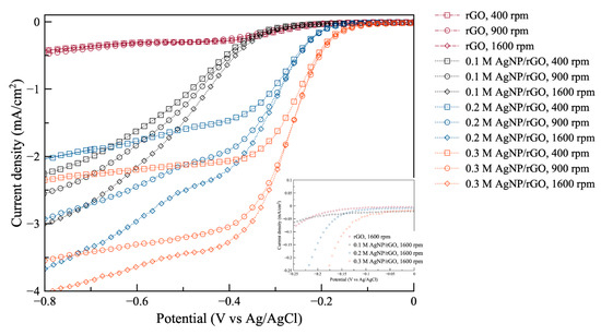 Oxygen reduction reaction (ORR) polarization curves of the prepared samples: rGO, 0.1 M AgNP/rGO, 0.2 M AgNP/rGO, and 0.3 M AgNP/rGO at 400, 900, 1600 rpm. The inset shows a magnified part of the original plot.