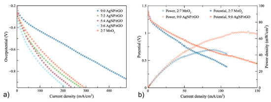 As regards air cathode polarization, the zinc–air battery was fabricated using the 0.3 M AgNP/rGO catalyst with different ratios of AgNP/rGO to carbon black: namely, 9:0, 7:2, 5:4 and 3:6. The air-cathode made of MnO2 to carbon black of 2:7, which is generally used as ORR electrocatalyst [42,43], was also included, as a reference, to compare the performance of the synthesized electrocatalysts. Figure 5a shows the overpotential of the air cathodes. Initially, in all cases, the overpotential dropped significantly. Then, it linearly decreased with discharge current density. The highest current density was obtained using the 9:0 AgNP/rGO cathode. The latter exhibited the current density of 410 mA cm−2 at overpotential of −0.8 V while the air-cathode made of 2:7 MnO2 showed the current density of 200 mA cm−2 at overpotential of −0.8 V. When the AgNP/rGO were mixed with conductive carbon additive, they showed a higher overpotential as compared to the 9:0 AgNP/rGO cathode. Consequently, the cathode using 9:0 AgNP/rGO was implemented in ZAB for measuring battery performance.