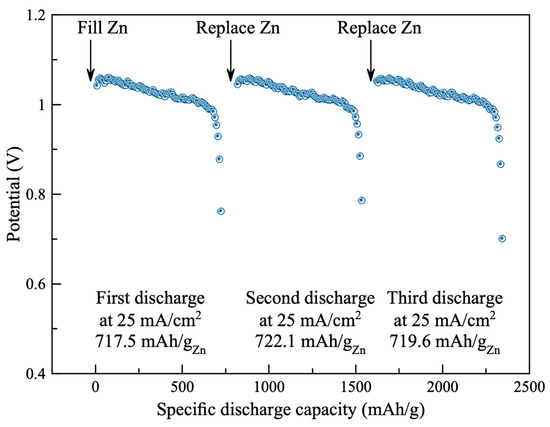 Stability of the air cathode using the synthesized catalyst (0.3 M AgNP/rGO) was examined. The battery was filled initially with 10 g of zinc granules and 15 mL electrolyte. The battery was then discharged at the discharge rate of 25 mA cm−2 until the discharge potential reached 0.7 V. The battery was then disconnected, cleaned and replaced with new zinc granules and fresh electrolyte. Three repetitions of discharge test were conducted. As shown in Figure 6, the galvanostatic discharge characteristics of the battery are displayed. In the first test, the battery exhibited discharge plateau at (1.05–0.99) V for discharge capacity of 717.5 mAh gZn−1. Moreover, the discharge characteristics of the second and third tests were like the first test. The second and the third tests exhibited discharge capacities of 722.1 and 719.6 mAh gZn−1, respectively. The significant degradation of the battery was not observed. Results demonstrated excellent stability of the air cathode.