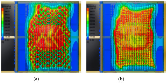 In order to find the proper amount of fuel flow rate to match the experimental results in Figure 6b, a CFD analysis was performed with the reduced amount of fuel delivered to each module. Figure 9b,c shows the CFD results with fuel cut down by 15% and 30%, respectively, at the fuel flow rate in Figure 9a. As shown in Table 2, the simulation case with a 30% fuel cut most closely predicts the temperature measured in the experiment. Therefore, in the experiment of Figure 6, the mass flow rate of LPG actually supplied to Bunsen burners is expected to be about 24.6 kg/h per module in the left half and about 35 kg/h per module in the right half. According to the CFD results for the 30% fuel cutoff condition in Table 2, the temperature in the left half showed a downward deviation in the target temperature range of the fire resistance test (800‒1100 °C). On the other hand, the temperature in the right half satisfied the criterion of the temperature range during the 2-min test period. Therefore, the appropriate LPG mass flow rate to meet the test criterion is around 35 kg/h per module.