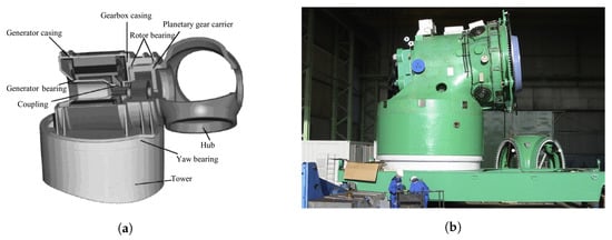 The multibrid configuration (Figure 2a), with a single-stage planetary gearbox associated to a medium speed PMG, combines the advantages of both geared and gearless drivetrain [12]. Indeed, a medium speed generator is cheaper and more efficient than a direct-drive one and a single-stage gearbox is lighter and more reliable than a multiple-stage one. Wind turbines manufacturers have developed multibrid technology such as Multibrid (M5000) and WinWind (WWD-3) [13] (Figure 2b), [14]. The same concept has been designed, realized, and tested for a small scale TST system in the Chinese Zhoushan water channel [15] (Figure 3).