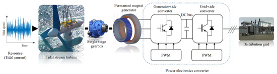 Tidal stream energy is one of the promising renewable energy sources, which is highly predictable and its potential can exceed 120 GW [1,2]. It is mainly harnessed by horizontal axis turbines where the marine current kinetic power is converted into an electrical one. Despite the infancy of tidal stream turbine (TST) technologies, various machines and prototypes have been developed in recent decades, and different concepts are competing for supremacy [3,4,5]. In addition to the technology infancy, the harsh submarine environment increases the criticality of the TST subsystems. Therefore, the main challenges that face the tidal stream turbine industry are the energy cost and the system reliability, which means simple and reliable technologies should be adopted. Drivetrain and generator topology choice typically affects the availability of the system as well as the produced energy cost. The main TST configuration types are gearless TST (direct-drive), mechanically geared TST, and magnetically geared TST [6,7,8].