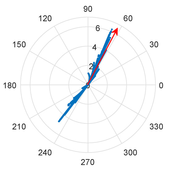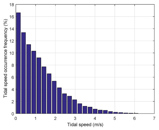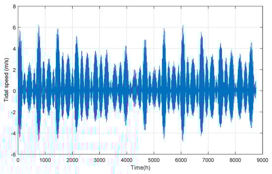 Tidal current velocity data in the site near Ouessant Island were collected by the French navy hydrographic and oceanographic service [21]. The amplitude and direction measurements of the tidal current velocity are done hourly during one year (8760 h). The optimal direction, which provides the maximum of energy, is calculated as described in [22] (Figure 5). Tidal speed through the optimal direction is shown in Figure 6.