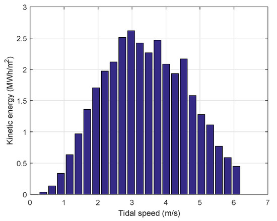 The annual energy production (AEP) can be calculated by summing the harnessed energy in each hour (the tidal current speed is assumed non-variable). Figure 7 shows the energy distribution according to tidal current speed amplitude in the Ouessant site.