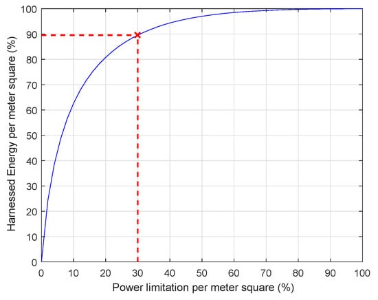 To harness all the energy, a maximal power should be chosen as a rated one and an oversized system will be required. In wind turbines, mechanical limitation of power using blade or yaw pitch subsystems are adopted. However, due to the harsh submarine conditions such mechanical subsystems should be avoided. An alternative using an over-speed power limitation is adopted in this study. In this context, when the input power is less than the rated one, the power coefficient is maintained at his maximum (Table 1). However, when the input power is higher than the rated one, the generator accelerates and reduces the power coefficient. This methodology is detailed in [8]. The power rating (limitation power) is chosen around of the maximum power where of the total energy can be harnessed (Figure 9). As the swept area considered is 1 m2, the same power ratio of is maintained, and for each power rating (500 kW, 1.5 MW, 5 MW) only the blade’s diameter (swept area) is calculated.