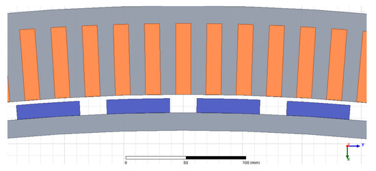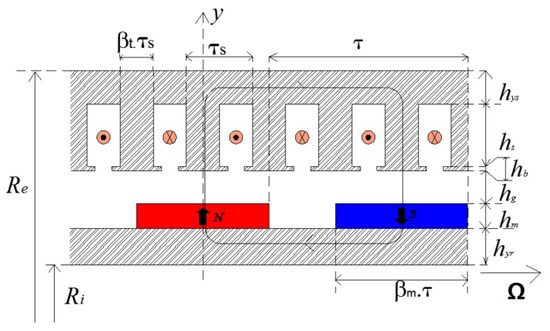 The generator considered in this paper is a three phase radial flux permanent magnet one [8]. Figure 11 shows the geometric parameters of one pair of poles and its structure. The magnets are surface mounted and the generator curvature is assumed insignificant. For design purposes, the adopted modeling is a 2D analytical electromagnetic model based on magnetic circuit calculation [18,28]. The objective is to calculate the size of the generator knowing its specifications.