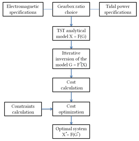 The design optimization is based on the modeling of each part of the system (the turbine, the gearbox, the power electronics converters, and the PMG generator). The electromagnetic specifications are all the fixed design parameters, the gearbox ratio is chosen before the optimization process starting, and tidal power specifications are calculated from tidal current speed data. The analytical model can be represented by a non-linear function, which has as input a geometrical design variables vector. To evaluate the cost-function, an iterative inversion of the non-linear model is adopted. By considering the constraint, the interior-point optimization technique is used to minimize the cost-function. The optimal design is the one which has the lowest cost (Figure 12).