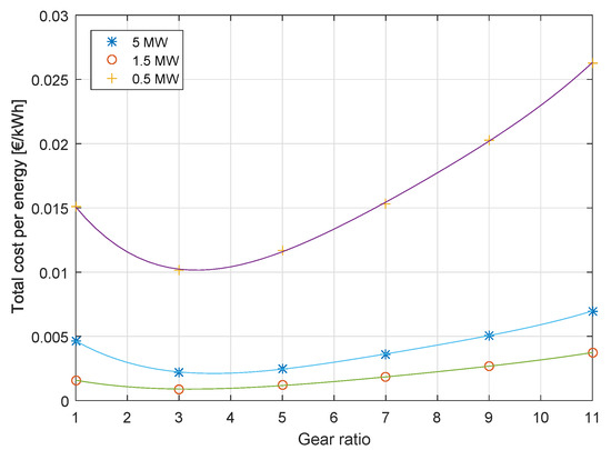 To investigate the cost-effectiveness of the multibrid concept in TST systems, design optimization of the system is performed for different gearbox ratios (1:1,3:1,5:1,7:1,9:1,11:1) and different power ratings (0.5 MW, 1.5 MW, 5 MW). The total harnessed energy in the Ouessant site is calculated for each power rating. According to the optimization results, the gear ratio (3:1) is the optimal one whatever the power level is (Figure 13). When it is less than (5:1), geared systems are cheaper than direct-drive ones. Concerning the estimated TST cost per kWh (Figure 14), the 1.5 MW and 5 MW TST energy is cheaper than the 500 kW TST one. It seems that a rated power around 1.5 MW for the Ouessant site is more preferable than very high power ratings.
