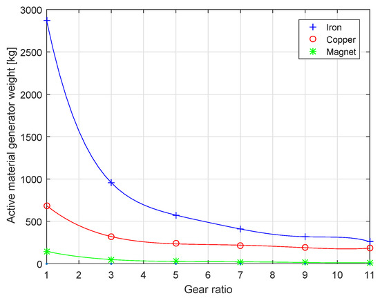 The weight of the planetary single stage gearbox is a function of the gear ratio and the transmitted shaft torque [25]. Equation (4) is developed to obtain the planetary gearbox total weight.