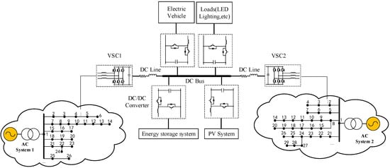 In the multi-terminal AC/DC system shown in Figure 1, AC systems 1 and 2 interconnect with each other via the DC network. The AC side of VSC1 and 2 connect to AC system 1 and AC system 2 respectively, and their DC sides feed into the DC bus through DC line. The DG, ESS, and electrical vehicle, can be integrated in the DC network, and their DC voltage can be adjusted by additional DC/DC converters while mismatching with the DC bus voltage. The energy flow on DC bus can consist of two parts: the part of energy production using PV system or ESS under discharge which arrives on DC bus, and the other part of the energy consumed by DC loads such as electrical vehicle, or ESS under charge. When the output power from the power generation unit is greater than the power absorbed by DC loads, the excess energy will be delivered to the AC systems through the multi-terminal DC structure. Otherwise, the AC systems will deliver power to the DC system.