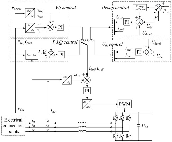 Various control strategies can be applied to each VSC, such as the Udc control, the P&Q control, the V/f control, and the Droop control, as demonstrated in Figure 2.
