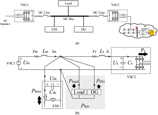 In the shown system, VSC1 connects to the DC bus via DC line (rm, Lm); VSC2 connects to the DC bus via DC line (rs, Ls). ESS connects to the DC bus to provide fast power adjustment (The storage system proposed in this article is based on batteries, 20 Ah, 27 V Lithium battery module and the corresponding ESS are adopted). Um and im represent the DC-side voltage and current of VSC1 respectively. As the master station, the value of Um is normally considered as fixed. Us, is, Cs and Ps represent the DC-side voltage, current, capacitance and transfer power of VSC2 respectively. Udc and Cdc represent voltage and the equivalent capacitance of the DC bus. Pbess, Pload, and PDG represent respectively the ESS power, the load power, and the DG output power. Pbus is the equivalent load power in the DC bus which satisfies: