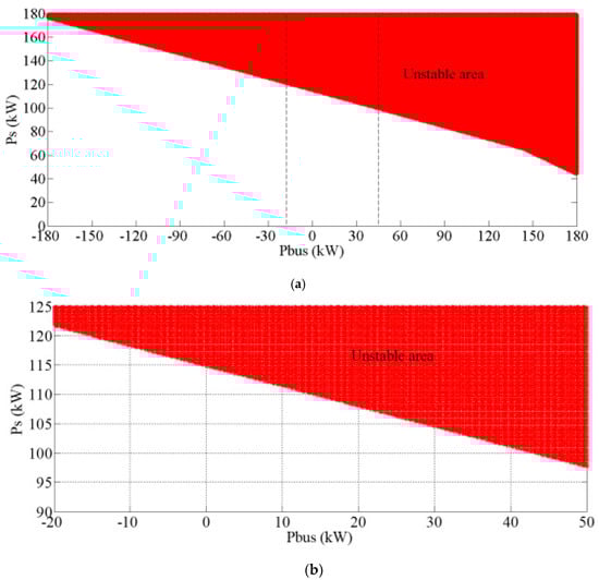 It can be known from Equation (3) that, under the certain structure of the multi-terminal AC/DC system, the stability of the system mainly depends on the mutual effect of Pbus and Ps. Both the equivalent load of the DC bus and VSC2 under the P&Q control have the negative impedance feature, which directly affecting the stable domain of system. This means that when Pbus changes, the maximum power transfer capacity of VSC2 also has relevant variation, in order to keep the system stable and vice versa. The system parameters are displayed in Table 1. The rated capacity of VSC2 is 180 kW and the corresponding Ps power transfer range is shown in Figure 4a (in this paper, the power flows out from the DC bus is considered as the positive direction).
