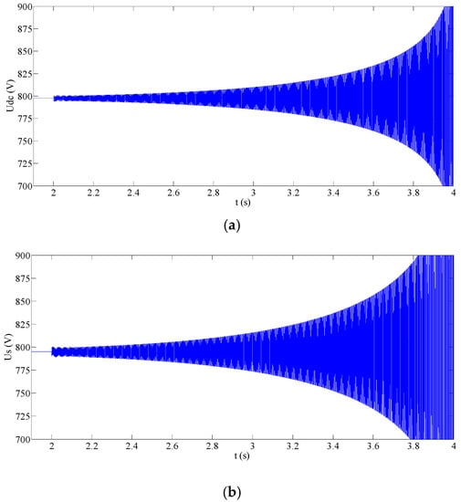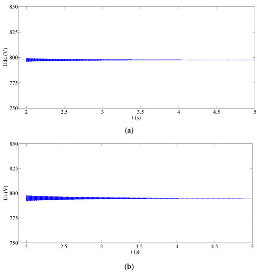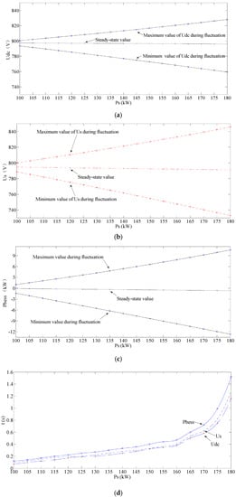 Figure 12 describes the analytical results under Ps changes from 90 kW to 100 kW–180 kW (each 5 kW is an interval). From 12a, Udc can stay stable under all the different operating conditions mentioned above and their steady-state values are approximately constant. The amplitude of fluctuation is all within ±4.93% of their steady-state values during the regulation process. Figure 12b shows that Us can remain stable under all situation and their steady-state values are nearly the same with each other. During regulation, the fluctuating range of Us is all within ±7.35% of their steady-state value. By comparing the two subfigures, the fluctuation amplitude of Us is always larger than that of Udc during regulation process under the same power transfer variation.