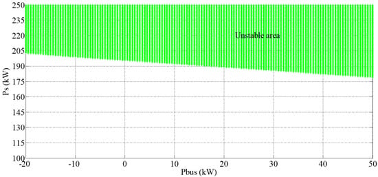 Figure 8 describes the power transfer boundary of the multi-terminal AC/DC system with the ESS, and after being performed by the additional control strategy with Pbus changing from −20 kW to 50 kW (The parameters for calculation is the same as in Table 1). Comparing Figure 4b and Figure 8, it can be known that after applying the additional control, the power transfer boundary of Ps is significantly improved. Taking Pbus = 50 kW as an example, the maximum transfer power of Ps after applying the additional control based on the ESS is around 183 kW, however, it is about 97 kW without the additional control, which has an improvement of almost 90%. This implies that the damping ability can be provided by additional control based on the ESS in the multi-terminal AC/DC system. Therefore, the power transfer capacity of VSC2 can be expanded effectively. This control method can also stabilize some operating points which would lose its stability before applying the additional control.