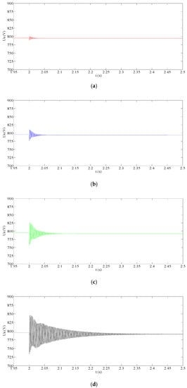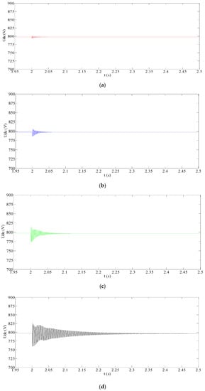 Simulation results of Udc: (a) Ps changes from 90 kW to 100 kW; (b) Ps changes from 90 kW to 120 kW; (c) Ps changes from 90 kW to 150 kW; (d) Ps changes from 90 kW to 180 kW.