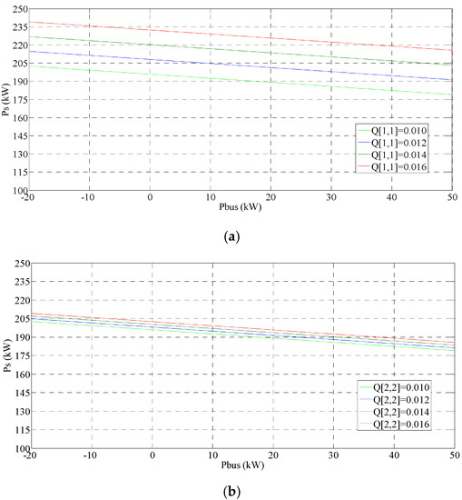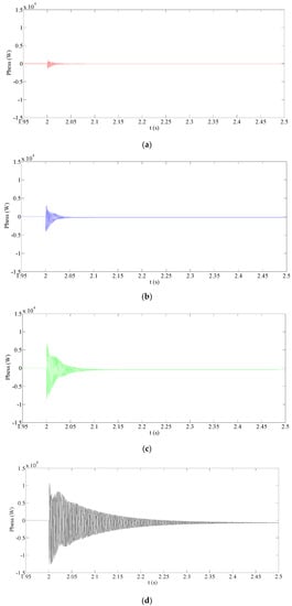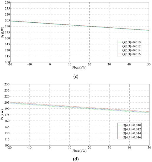 Figure 13 implies that under the same change range [0.01 0.016], the improvement of the power transfer boundary under the weighting parameters change at Q[1,1] is the most significant, then followed by change at Q[2,2], and the smallest when change at Q[3,3]. Taking Pbus = 50 kW as an example, the maximum transfer power of Ps after applying the additional control based on the ESS is around 215 kW, 185 kW, 180 kW, and 183 kW under the weighting parameters change at Q[1,1], Q[2,2], Q[3,3], Q[4,4], respectively. From the sensitivity analysis, designing a reasonable matrix Q, especially Q[1,1], is an important foundation for improving the performance of the additional control and expanding system power transfer boundary.