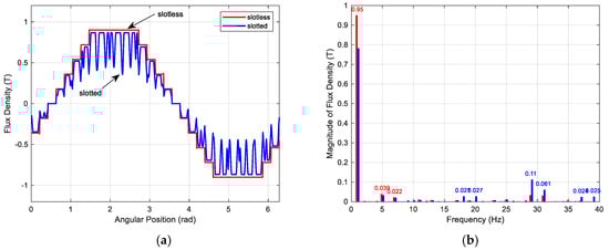 The left side of Figure 8 compares the flux density waveform obtained using proposed analytical approach (red line) to the one derived from FEA (blue line). To ensure better clarity, the blue line is inverted. The right side of Figure 8 shows comparison between harmonic spectrum corresponding to both waveforms.