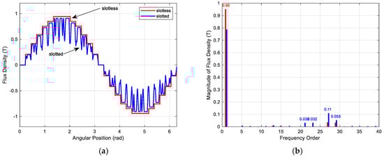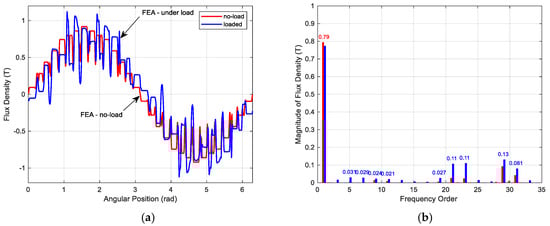 (a) Final air gap flux density for motor operating under load condition; flux density distribution (left)—blue line inverted, (b) frequency spectrum (right).