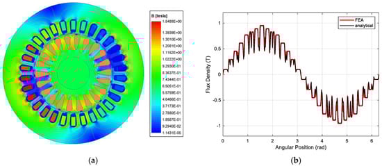 To demonstrate validity of the method, we can analyze (using FEA) the air gap magnetic field of real 3 kW five-phase induction motor corresponding to the case study shown in Figure 2. The motor geometry with magnetic distribution is shown on the left side of Figure 4. The right side of the same figure shows the resulting air gap flux density calculated using FEA and compared to given analytical approach. In order to compare comparable, the FEA considers no-load state (zero torque) and magnetic core composed of linear steel having very high relative permeability ().