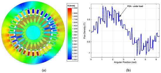 (a) Flux density distribution inside the machine under load, (b) air gap flux density.