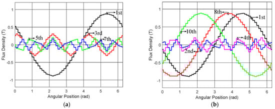 Second, the flux density formed by a five-phase, full-pitched, winding having , , and q = 3 is shown in Figure 2.