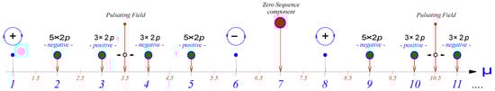 First, the spectrum includes all harmonics orders calculated from (19). When the operator “+” is used, the relevant harmonic generates mmf travelling the air gap together with the fundamental harmonic but -times slower, and to the contrary, the operator “−” gives harmonics producing waves traveling the air gap in opposite direction (also -times slower).