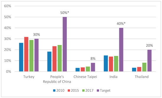 Figure 2). According to data provided by the IEA, none of the countries with set targets have achieved their targets, aside from Turkey which achieved its target in 2015.