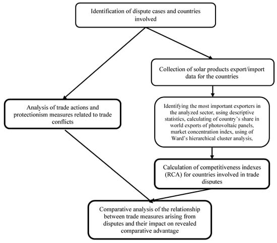 We believe that in the solar energy sector, the global interest differences leading to trade conflicts have not been sufficiently investigated. The studies published so far focused primarily on issues of technology development [29,30,31,32,33], domestic policies in energy sector and their effects on the implementation of the sustainable development strategy [34,35,36,37,38,39,40,41,42,43]. Existing research on trade disputes in solar sector usually focus on a single case of conflict in bilateral relations only, for example between the EU and China [44,45] or the US and China [28,46,47,48], while in this paper we attempt to analyze a broader range of trade disputes.