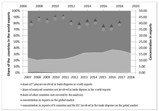 Share of analyzed countries in total exports and concentration of world’s photovoltaic panels exports in 2007–2018. Source: own elaboration based on the ITC Trade Map [84].