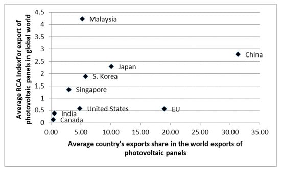 Revealed Comparative Advantage (RCA) index versus country’s exports share in the world exports of photovoltaic panels. Source: own elaboration.