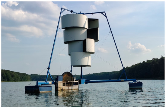One of the methods of mechanical lake restoration is the method of moderate oxygenation of hypolimnion water using wind-driven pulverizing aerators. In addition to improving oxygen conditions in the hypolimnion water, water circulation is forced and specific biological effects are obtained [10]. The technology of pulverizing aeration was developed by Professor Stanisław Podsiadłowski from the Institute of Agricultural Engineering at the Agricultural University of Poznan. The aerator uses only wind energy to drive the pulverization unit. The efficiency of the device depends primarily on wind speed. A properly designed pulverization unit in the machine enables the release into the atmosphere of harmful gases from the anaerobic transformation of organic matter (hydrogen sulfide, methane, and ammonia) and introduce in their place—in particular, oxygen [18]. The device maintains oxygen conditions in the bottom zone in the range of 0–1 mg O2·dm-1. According to Kowalczewska-Madura et al. [2], the advantage of moderate over intensive oxygenation is the maintaining of a positive redox potential at the sediment–water interface, which allows for phosphorus retention, limiting the mineralization of organic matter deposited in bottom sediments and allowing the anammox process to occur. As a result, ammonium nitrogen is oxidized to N2 forms and enables nitrification and denitrification processes, which result in nitrogen removal to the atmosphere [19]. The aerator wind turbine can drive the pulverization unit at a wind speed of 2 m∙s–1 [20]. Wind-driven pulverizing aerators (Figure 1) are fully mechanically resistant to impurities deposited in the bottom zone of the water where they work.