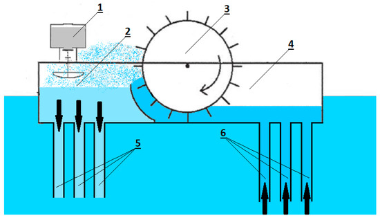 Scheme of the pulverization unit in the aerator. Note: 1, coagulant applicator; 2, pressuring chamber; 3, pulverizing circle; 4, suction chamber; 5, pressuring hoses; 6, suction hoses.