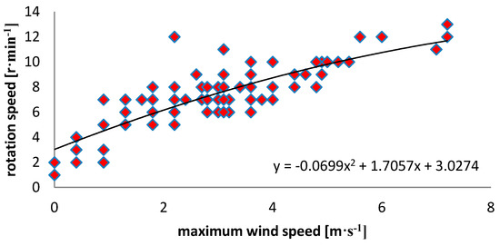 In the next stage, in accordance with Equation (3), a rotational speed model of the aerator pulverization wheel model was determined. The model was determined, based on wind speed. Data on wind speed were obtained based on our own research conducted from spring to late autumn of 2018 using the Davis Instruments Vantage Vue DAV 6250EU weather station. Using the weather station, maximum wind speeds were determined in 1 minute periods, while counting the number of revolutions of the aerator wind turbine. Tests were performed in dozens of repetitions for different maximum wind speeds. Based on collected results, the linear regression equation was in the form of a 2nd degree polynomial.
