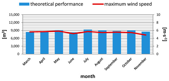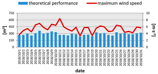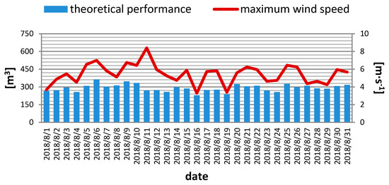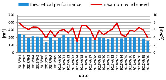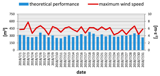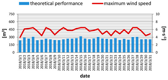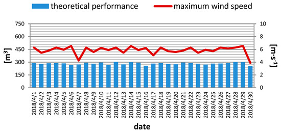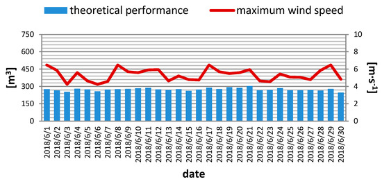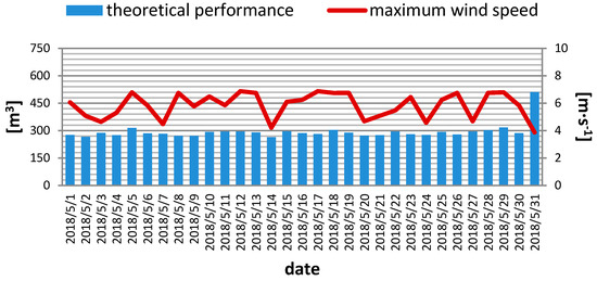 The wind conditions recorded on the last day of May in 2018 (Figure 6) allowed for the capacity to exceed 450 m3 per day.