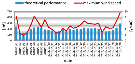 In November (Figure 12), over 11 days, an efficiency exceeding 300 m3 per day was achieved. However, on four days of the month, the efficiency was similar to or less than 175 m3 per day. The changing wind conditions in November were characteristic of the late-autumn temperate zone climate.