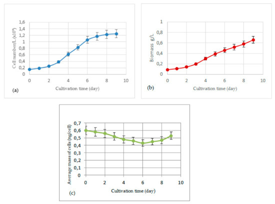In addition, during the last three days of culture, cell division ceases while biomass production continues, and the average cell mass increases. Since the culture of microalgae is carried out in batch, this increase could be due to the accumulation of lipids following the depletion of one of the nutrients essential for growth, such as phosphorus or nitrogen. Indeed, the accumulation of lipids in response to this stress was observed in free R. subcapitata [39] and in other species of microalgae [39,40] including Chlorococcum oleofaciens, Scenedesmus almeriensis, and Nannochloropsis sp. F & M-M24.